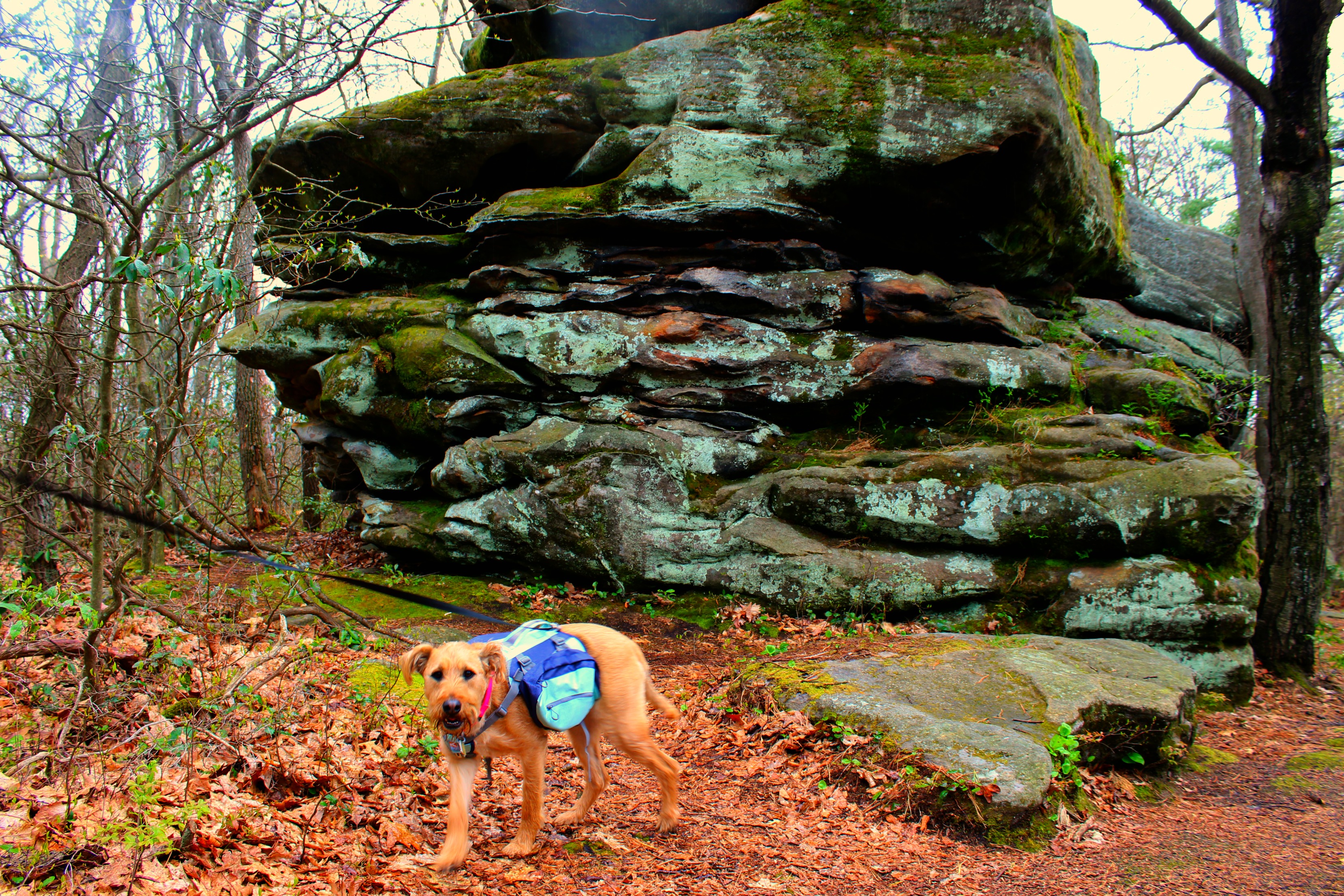 After Elijah, I took Mocha up to Jake’s Rocks Overlooks. There are 2 overlooks on the designated loop, but a little secret from one adventurer to another, the best overlook is on a trail that starts in the picnic area! I always take Mocha on this lesser known trail because there is so much more space to wander. It’s also fun to climb the rocks when you have a friend with you! The overlook that we hiked to takes about 5 minutes to get to. We passed massive boulders covered with bright green moss, and Mocha even made a new Dalmatian friend!
